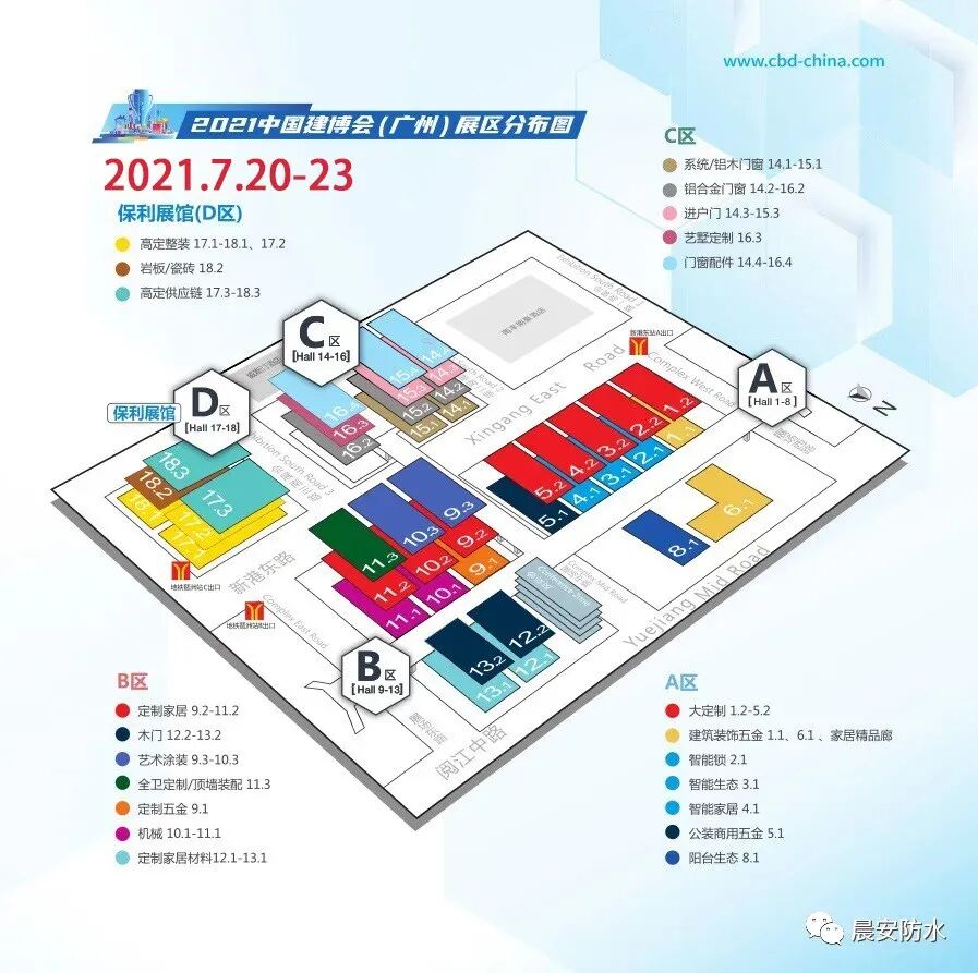 晨安防水广州建博会展位:广交会展馆(琶洲馆)B区9.3-32号